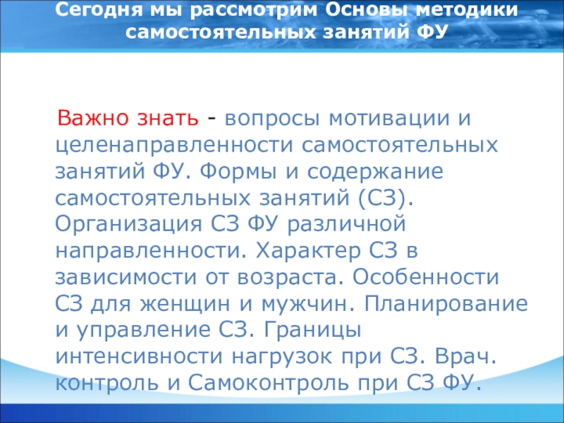 Слайд 9Сегодня мы рассмотрим Основы методики самостоятельных занятий ФУ
