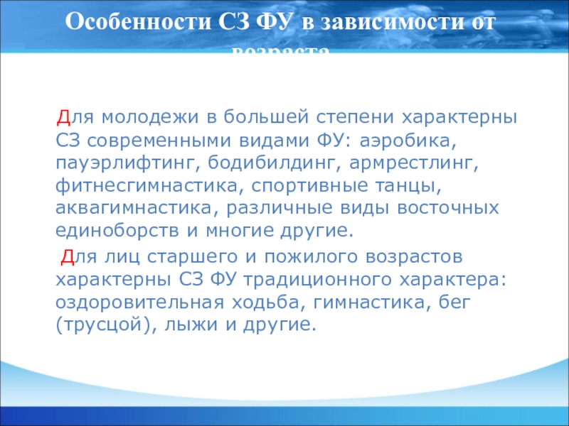 Для лиц старшего и пожилого возрастов характерны СЗ ФУ традиционного характера: оздоровительная ходьба, гимнастика, бег (трусцой), лыжи и другие.