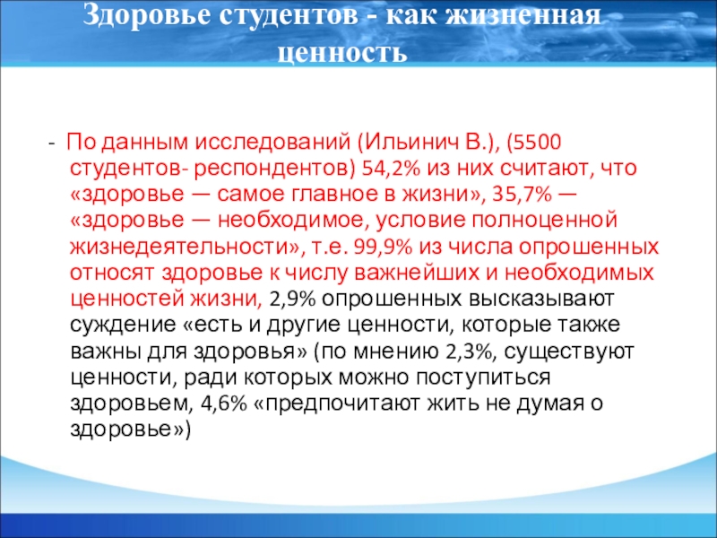 В.), (5500 студентов- респондентов) 54,2% из них считают, что «здоровье — самое главное в жизни», 35,7% — «здоровье — необходимое, условие полноценной жизнедеятельности», т.е. 99,9% из числа опрошенных относят здоровье к числу важнейших и необходимых ценностей жизни, 2,9% опрошенных высказывают суждение «есть и другие ценности, которые также важны для здоровья» (по мнению 2,3%, существуют ценности, ради которых можно поступиться здоровьем, 4,6% «предпочитают жить не думая о здоровье»)