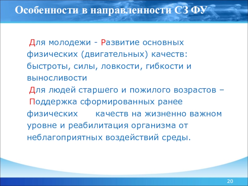 Слайд 20 Для молодежи - Развитие основных физических (двигательных) качеств: