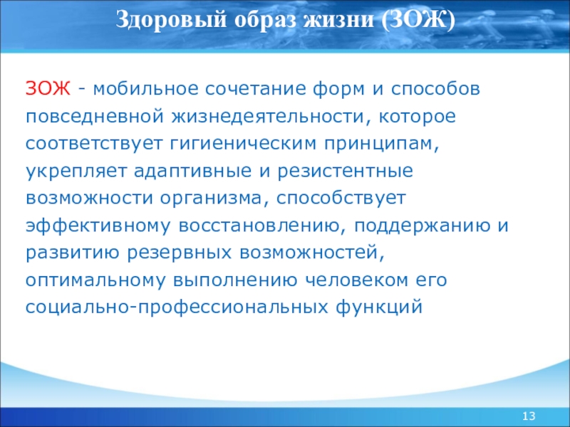 Слайд 13ЗОЖ - мобильное сочетание форм и способов повседневной жизнедеятельности, которое соответствует
