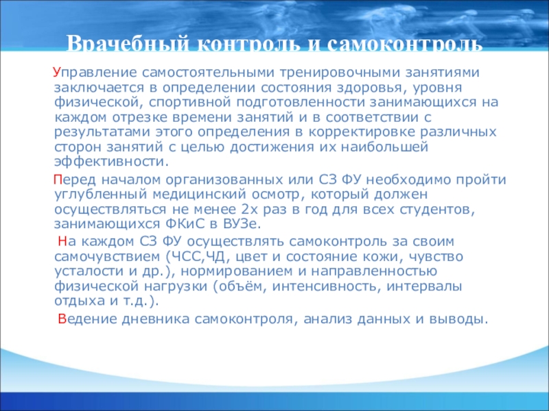 Врачебный контроль и самоконтроль, соблюдение гигиенических требований и организационно - методических принципов - доступности, преемственности, последовательности и систематичности.
