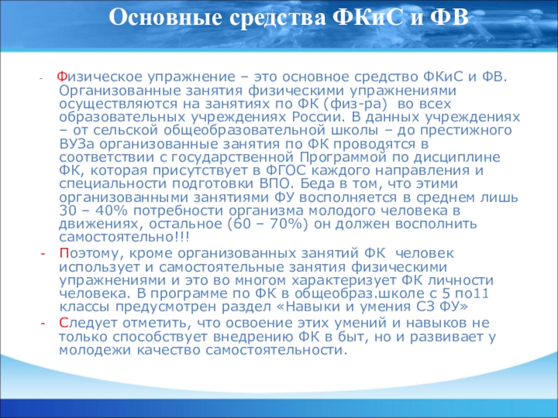 основное средство ФКиС и ФВ. Организованные занятия физическими упражнениями осуществляются на занятиях по ФК (физ-ра) во всех образовательных учреждениях России. В данных учреждениях – от сельской общеобразовательной школы – до престижного ВУЗа организованные занятия по ФК проводятся в соответствии с государственной Программой по дисциплине ФК, которая присутствует в ФГОС каждого направления и специальности подготовки ВПО. Беда в том, что этими организованными занятиями ФУ восполняется в среднем лишь 30 – 40% потребности организма молодого человека в движениях, остальное (60 – 70%) он должен восполнить самостоятельно!!!