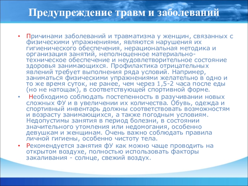 физическими упражнениями, являются нарушения их гигиенического обеспечения, нерациональная методика и организация занятий, неполноценное материально-техническое обеспечение и неудовлетворительное состояние здоровья занимающихся. Профилактика отрицательных явлений требует выполнения ряда условий. Например, заниматься физическими упражнениями желательно в одно и то же время суток, не ранее, чем через 1,5-2 часа после еды (но не натощак), в соответствующей спортивной форме.