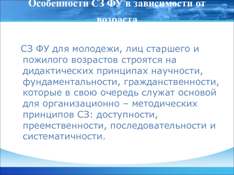 для молодежи, лиц старшего и пожилого возрастов строятся на дидактических принципах научности, фундаментальности, гражданственности, которые в свою очередь служат основой для организационно – методических принципов СЗ: доступности, преемственности, последовательности и систематичности.