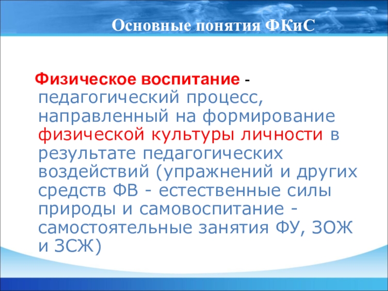 формирование физической культуры личности в результате педагогических воздействий (упражнений и других средств ФВ - естественные силы природы и самовоспитание - самостоятельные занятия ФУ, ЗОЖ и ЗСЖ)