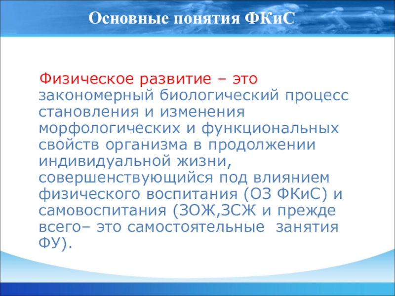 становления и изменения морфологических и функциональных свойств организма в продолжении индивидуальной жизни, совершенствующийся под влиянием физического воспитания (ОЗ ФКиС) и самовоспитания (ЗОЖ,ЗСЖ и прежде всего– это самостоятельные занятия ФУ).