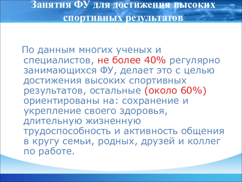 ученых и специалистов, не более 40% регулярно занимающихся ФУ, делает это с целью достижения высоких спортивных результатов, остальные (около 60%)ориентированы на: сохранение и укрепление своего здоровья, длительную жизненную трудоспособность и активность общения в кругу семьи, родных, друзей и коллег по работе.