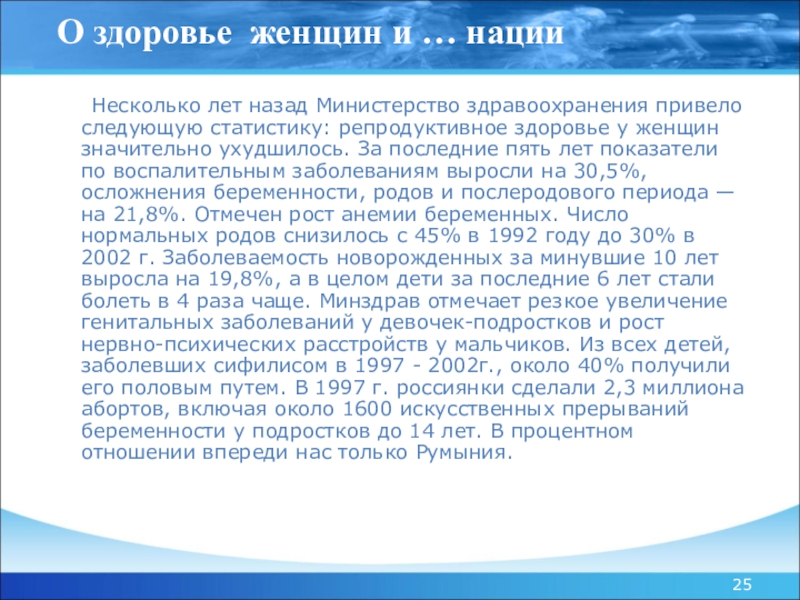 статистику: репродуктивное здоровье у женщин значительно ухудшилось. За последние пять лет показатели по воспалительным заболеваниям выросли на 30,5%, осложнения беременности, родов и послеродового периода — на 21,8%. Отмечен рост анемии беременных. Число нормальных родов снизилось с 45% в 1992 году до 30% в 2002 г. Заболеваемость новорожденных за минувшие 10 лет выросла на 19,8%, а в целом дети за последние 6 лет стали болеть в 4 раза чаще. Минздрав отмечает резкое увеличение генитальных заболеваний у девочек-подростков и рост нервно-психических расстройств у мальчиков. Из всех детей, заболевших сифилисом в 1997 - 2002г., около 40% получили его половым путем. В 1997 г. россиянки сделали 2,3 миллиона абортов, включая около 1600 искусственных прерываний беременности у подростков до 14 лет. В процентном отношении впереди нас только Румыния.