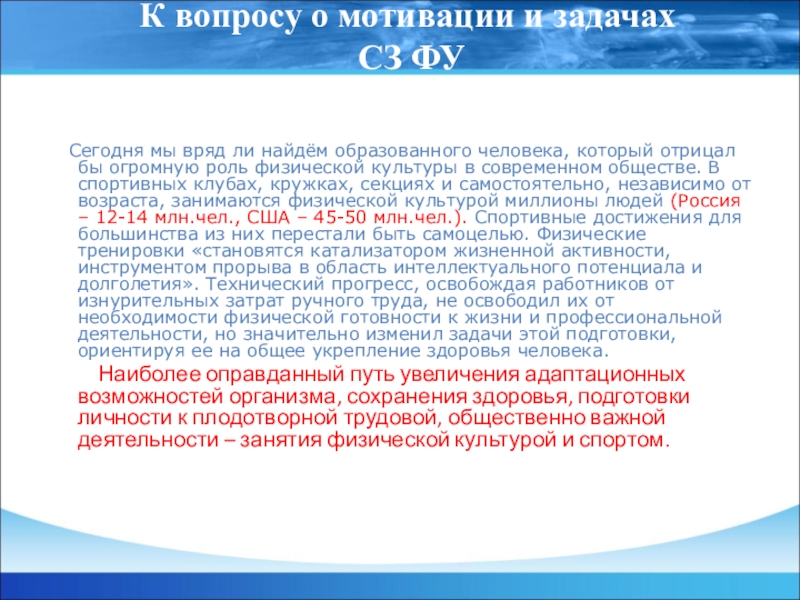 Сегодня мы вряд ли найдём образованного человека, который отрицал бы огромную роль физической культуры в современном обществе. В спортивных клубах, кружках, секциях и самостоятельно, независимо от возраста, занимаются физической культурой миллионы людей (Россия – 12-14 млн.чел., США – 45-50 млн.чел.). Спортивные достижения для большинства из них перестали быть самоцелью. Физические тренировки «становятся катализатором жизненной активности, инструментом прорыва в область интеллектуального потенциала и долголетия». Технический прогресс, освобождая работников от изнурительных затрат ручного труда, не освободил их от необходимости физической готовности к жизни и профессиональной деятельности, но значительно изменил задачи этой подготовки, ориентируя ее на общее укрепление здоровья человека.