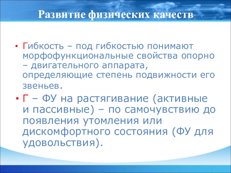 Гибкость – под гибкостью понимают морфофункциональные свойства опорно –