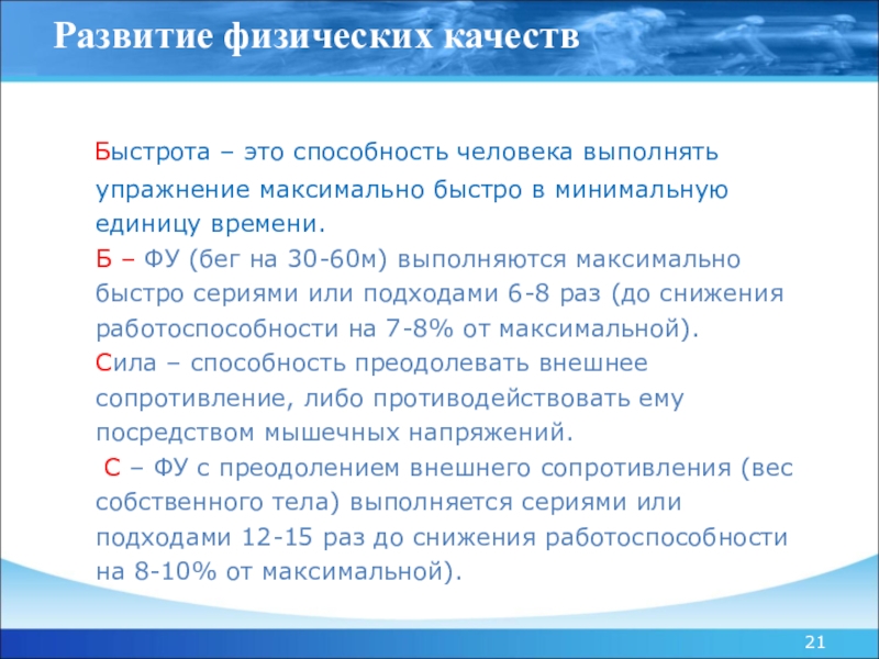 Слайд 21 Быстрота – это способность человека выполнять упражнение максимально быстро