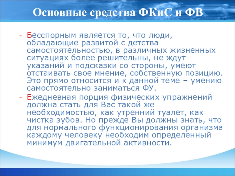 с детства самостоятельностью, в различных жизненных ситуациях более решительны, не ждут указаний и подсказки со стороны, умеют отстаивать свое мнение, собственную позицию. Это прямо относится и к данной теме – умению самостоятельно заниматься ФУ.