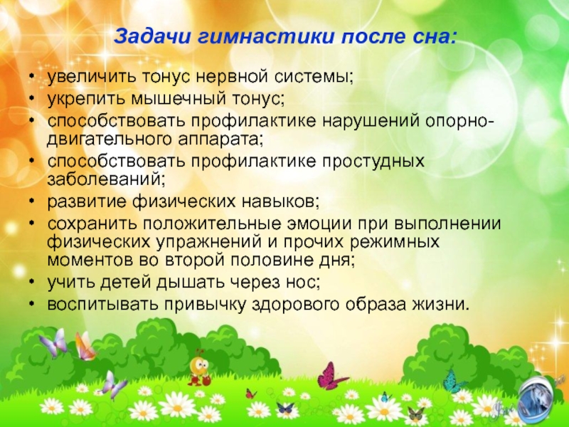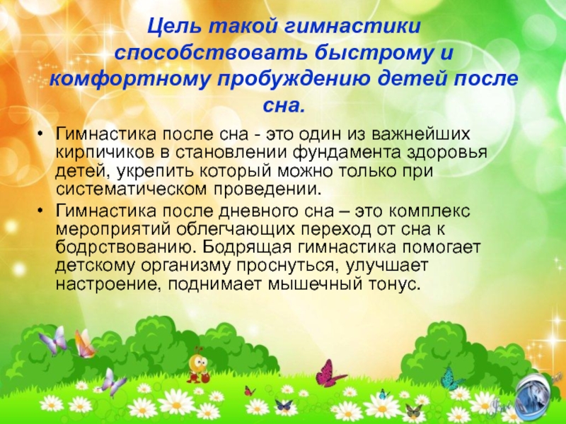 Гимнастика после дневного сна – это комплекс мероприятий облегчающих переход от сна к бодрствованию. Бодрящая гимнастика помогает детскому организму проснуться, улучшает настроение, поднимает мышечный тонус.