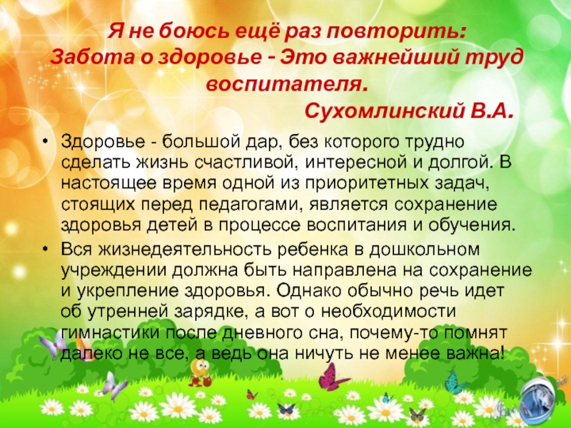 Здоровье - большой дар, без которого трудно сделать жизнь счастливой, интересной и долгой. В настоящее время одной из приоритетных задач, стоящих перед педагогами, является сохранение здоровья детей в процессе воспитания и обучения.
