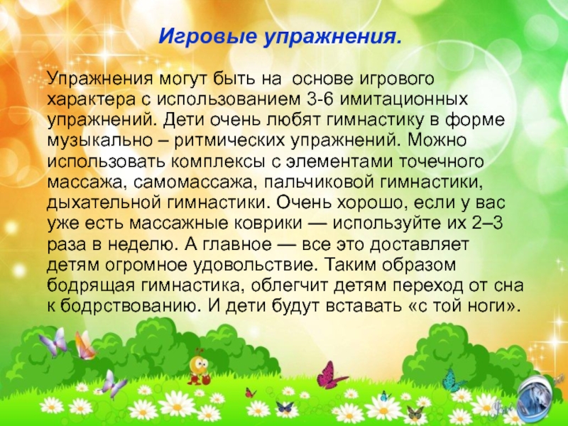 использованием 3-6 имитационных упражнений. Дети очень любят гимнастику в форме музыкально – ритмических упражнений. Можно использовать комплексы с элементами точечного массажа, самомассажа, пальчиковой гимнастики, дыхательной гимнастики. Очень хорошо, если у вас уже есть массажные коврики — используйте их 2–3 раза в неделю. А главное — все это доставляет детям огромное удовольствие. Таким образом бодрящая гимнастика, облегчит детям переход от сна к бодрствованию. И дети будут вставать «с той ноги».