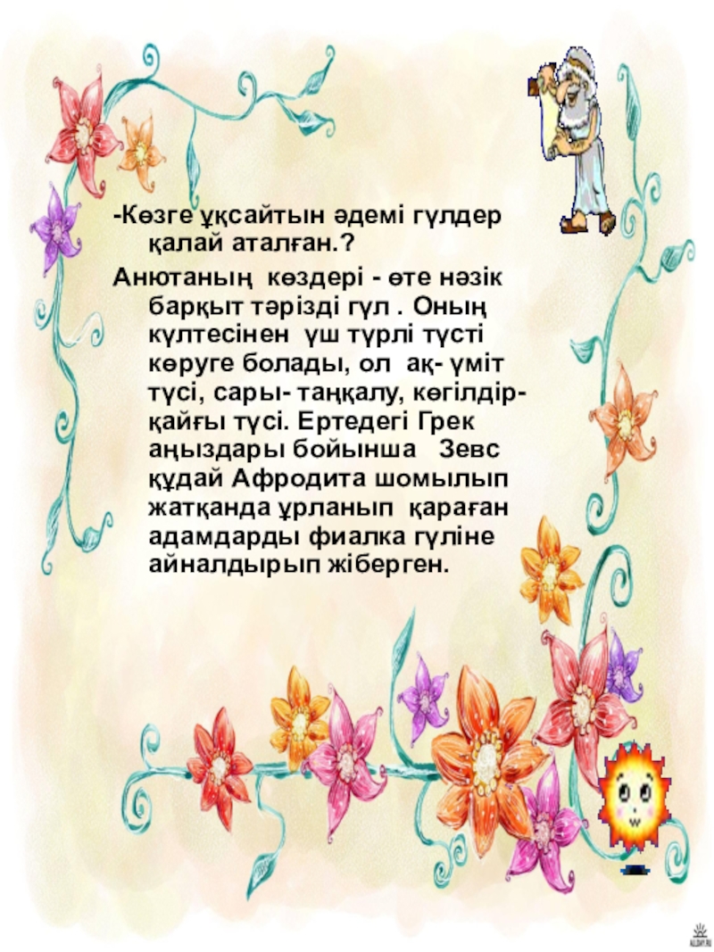 Слайд 17-Көзге ұқсайтын әдемі гүлдер қалай аталған.?