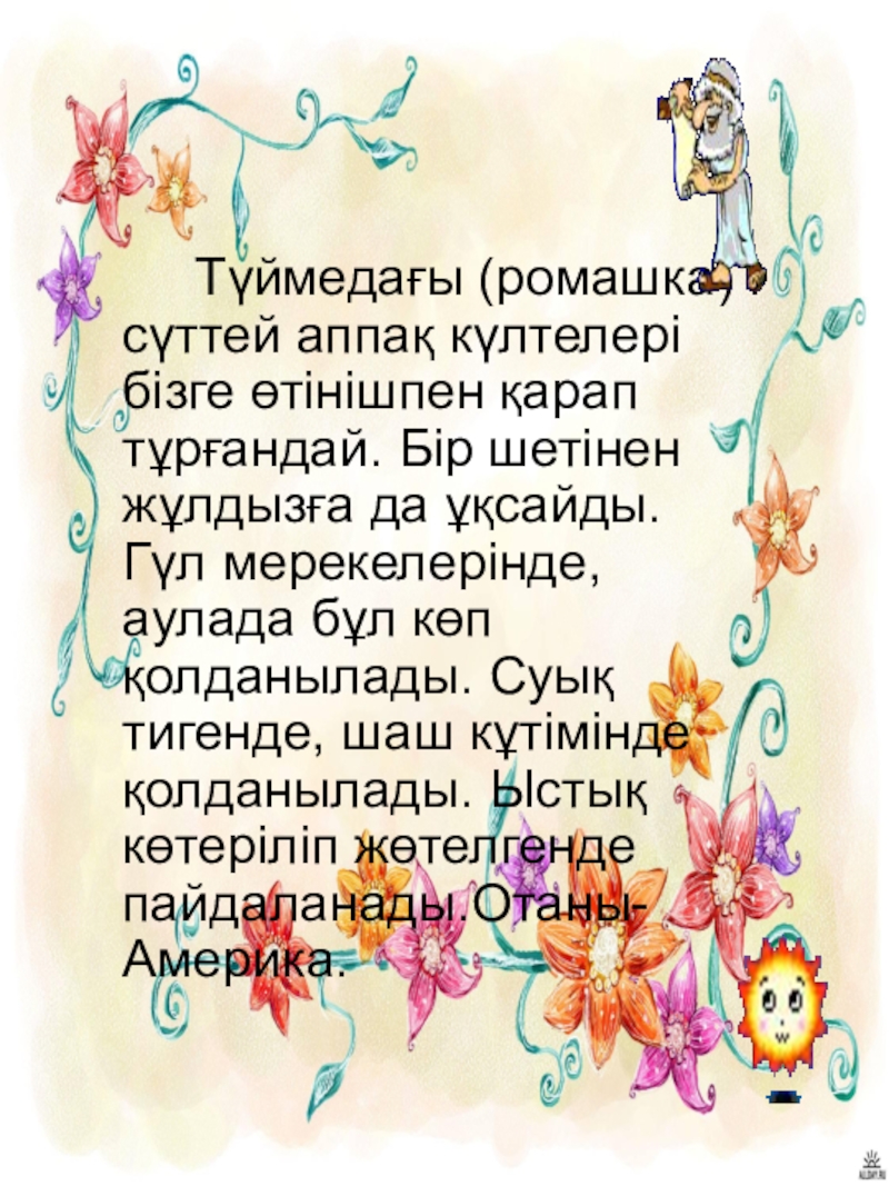 Слайд 9 Түймедағы (ромашка) сүттей аппақ күлтелері бізге өтінішпен