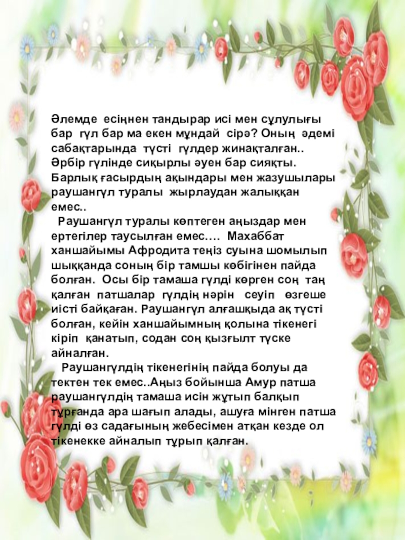 мұндай сірә? Оның әдемі сабақтарында түсті гүлдер жинақталған.. Әрбір гүлінде сиқырлы әуен бар сияқты. Барлық ғасырдың ақындары мен жазушылары раушангүл туралы жырлаудан жалыққан емес..