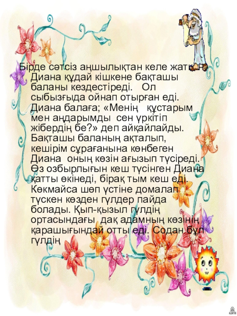 құдай кішкене бақташы баланы кездестіреді. Ол сыбызғыда ойнап отырған еді. Диана балаға; «Менің құстарым мен аңдарымды сен үркітіп жібердің бе?» деп айқайлайды. Бақташы баланың ақталып, кешірім сұрағанына көнбеген Диана оның көзін ағызып түсіреді. Өз озбырлығын кеш түсінген Диана қатты өкінеді, бірақ тым кеш еді. Көкмайса шөп үстіне домалап түскен көзден гүлдер пайда болады. Қып-қызыл гүлдің ортасындағы дақ адамның көзінің қарашығындай отты еді. Содан бұл гүлдің