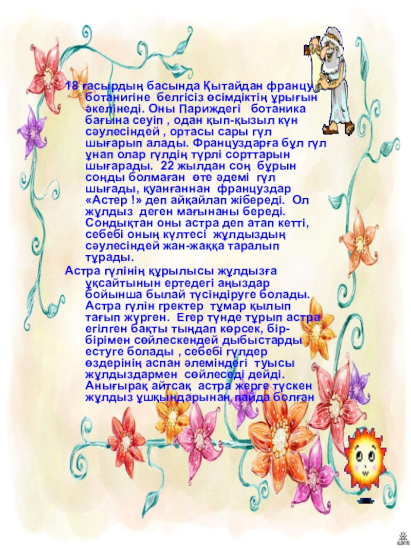 Париждегі ботаника бағына сеуіп , одан қып-қызыл күн сәулесіндей , ортасы сары гүл шығарып алады. Француздарға бұл гүл ұнап олар гүлдің түрлі сорттарын шығарады. 22 жылдан соң бұрын соңды болмаған өте әдемі гүл шығады, қуанғаннан француздар «Астер !» деп айқайлап жібереді. Ол жұлдыз деген мағынаны береді. Сондықтан оны астра деп атап кетті, себебі оның күлтесі жұлдыздың сәулесіндей жан-жаққа таралып тұрады.