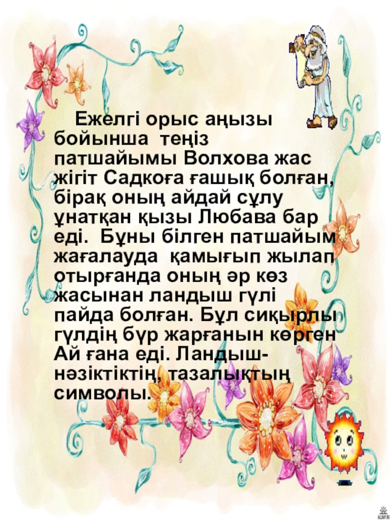 Волхова жас жігіт Садкоға ғашық болған, бірақ оның айдай сұлу ұнатқан қызы Любава бар еді. Бұны білген патшайым жағалауда қамығып жылап отырғанда оның әр көз жасынан ландыш гүлі пайда болған. Бұл сиқырлы гүлдің бүр жарғанын көрген Ай ғана еді. Ландыш-нәзіктіктің, тазалықтың символы.