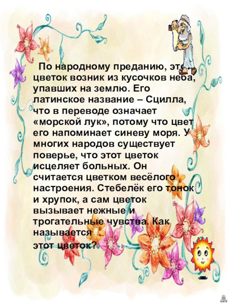 неба, упавших на землю. Его латинское название – Сцилла, что в переводе означает «морской лук», потому что цвет его напоминает синеву моря. У многих народов существует поверье, что этот цветок исцеляет больных. Он считается цветком весёлого настроения. Стебелёк его тонок и хрупок, а сам цветок вызывает нежные и трогательные чувства. Как называется