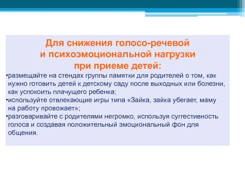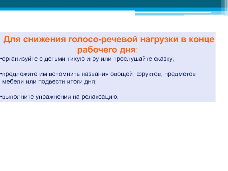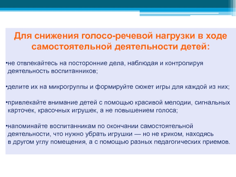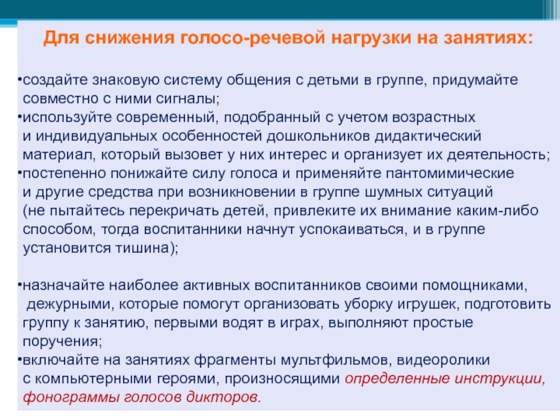 контролировать голосо-речевую нагрузку в течение дня: использовать «педагогические уловки»,