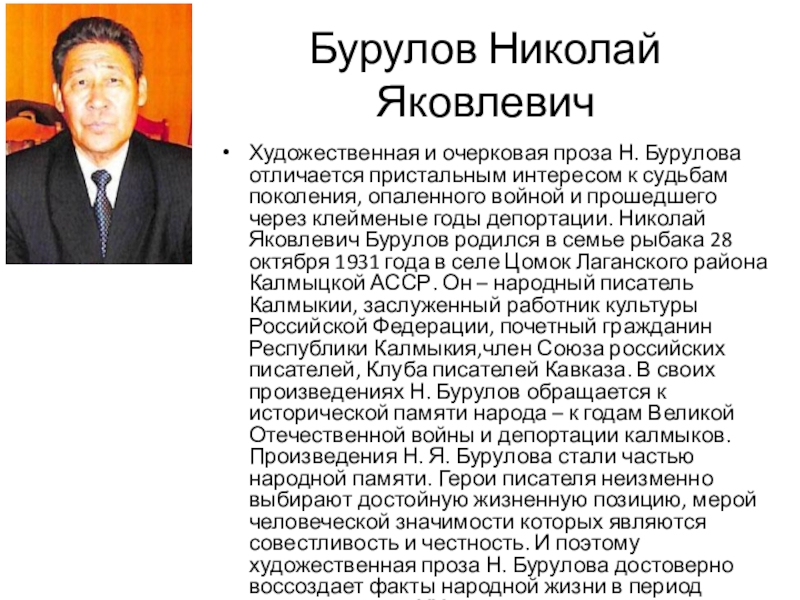 к судьбам поколения, опаленного войной и прошедшего через клейменые годы депортации. Николай Яковлевич Бурулов родился в семье рыбака 28 октября 1931 года в селе Цомок Лаганского района Калмыцкой АССР. Он – народный писатель Калмыкии, заслуженный работник культуры Российской Федерации, почетный гражданин Республики Калмыкия,член Союза российских писателей, Клуба писателей Кавказа. В своих произведениях Н. Бурулов обращается к исторической памяти народа – к годам Великой Отечественной войны и депортации калмыков. Произведения Н. Я. Бурулова стали частью народной памяти. Герои писателя неизменно выбирают достойную жизненную позицию, мерой человеческой значимости которых являются совестливость и честность. И поэтому художественная проза Н. Бурулова достоверно воссоздает факты народной жизни в период трагических вех ХХ века.