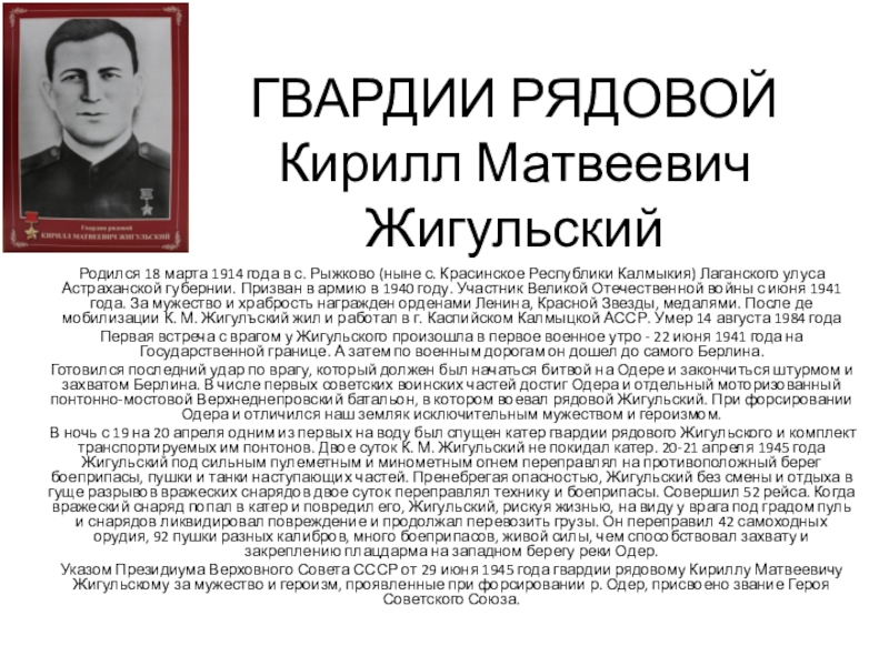 Указом Президиума Верховного Совета СССР от 29 июня 1945 года гвардии рядовому Кириллу Матвеевичу Жигульскому за мужество и героизм, проявленные при форсировании р. Одер, присвоено звание Героя Советского Союза.