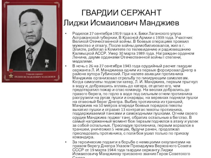 За героические подвиги в борьбе с немецкими оккупантами на правом берегу Днепра Указом Президиума Верховного Совета СССР от 19 марта 1944 года гвардии сержанту Лиджи Исмаиловичу Манджиеву присвоено звание Героя Советского Союза.