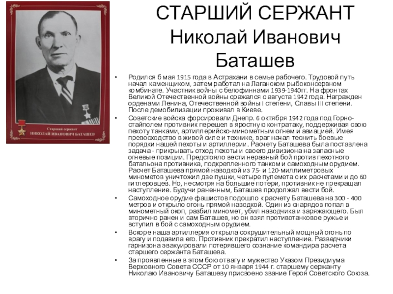 За проявленные в этом бою отвагу и мужество Указом Президиума Верховного Совета СССР от 10 января 1944 г. старшему сержанту Николаю Ивановичу Баташеву присвоено звание Героя Советского Союза.