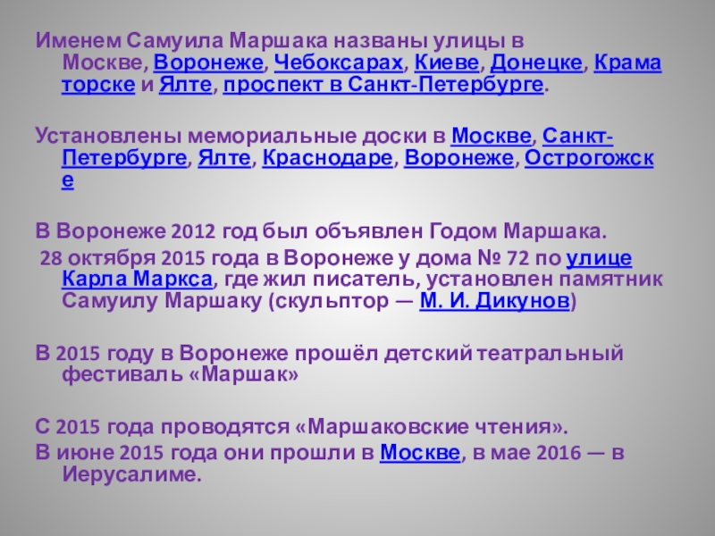 Слайд 33Именем Самуила Маршака названы улицы в Москве, Воронеже, Чебоксарах, Киеве, Донецке, Краматорске и Ялте, проспект в Санкт-Петербурге.
