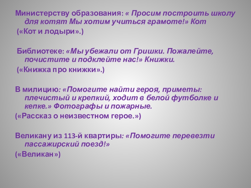 Слайд 40Министерству образования: « Просим построить школу для котят Мы хотим учиться