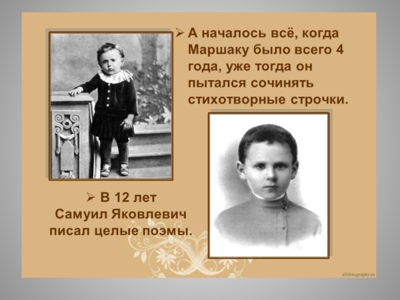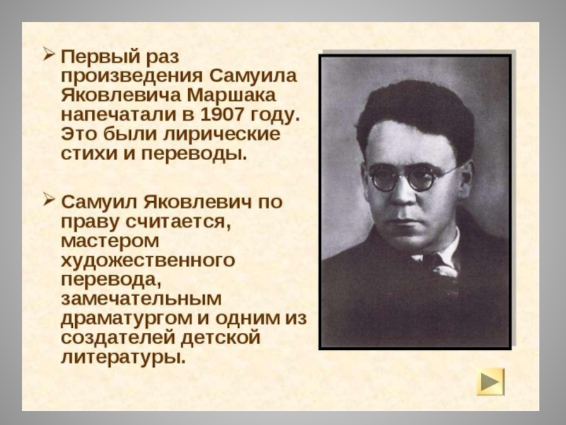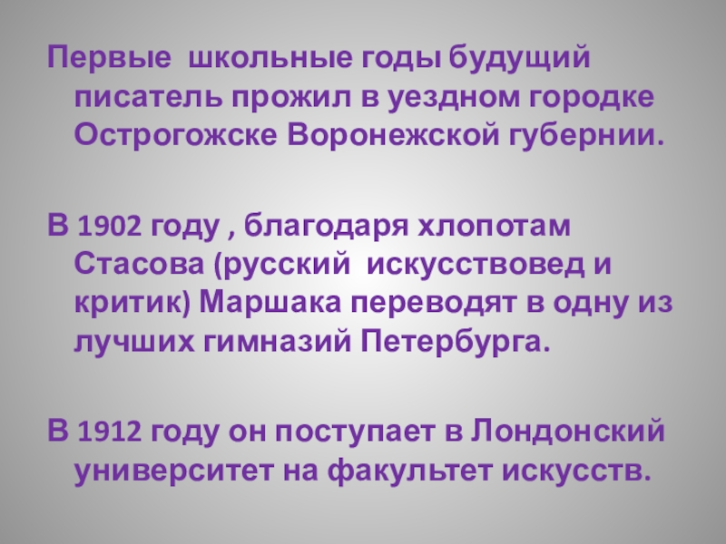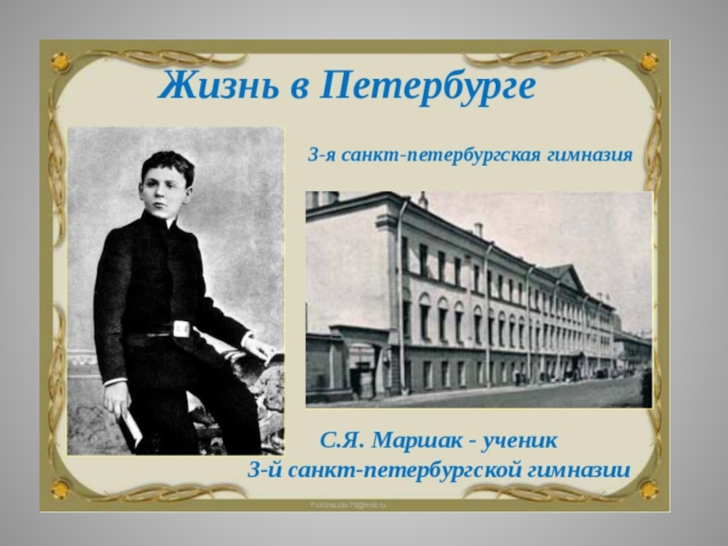 В 1902 году , благодаря хлопотам Стасова (русский искусствовед и критик) Маршака переводят в одну из лучших гимназий Петербурга.