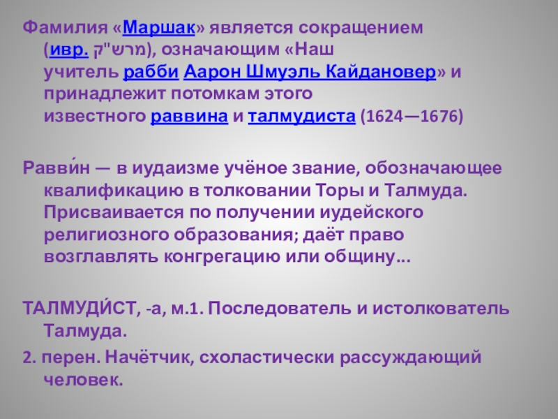 Слайд 2Фамилия «Маршак» является сокращением (ивр. מרש"ק), означающим «Наш учитель рабби Аарон Шмуэль Кайдановер» и
