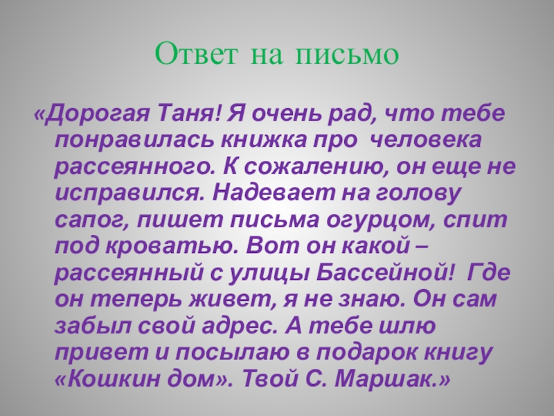 про человека рассеянного. К сожалению, он еще не исправился. Надевает на голову сапог, пишет письма огурцом, спит под кроватью. Вот он какой – рассеянный с улицы Бассейной! Где он теперь живет, я не знаю. Он сам забыл свой адрес. А тебе шлю привет и посылаю в подарок книгу «Кошкин дом». Твой С. Маршак.»