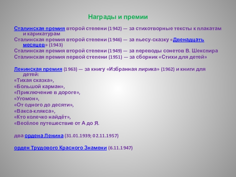 Сталинская премия второй степени (1946) — за пьесу-сказку «Двенадцать месяцев» (1943)