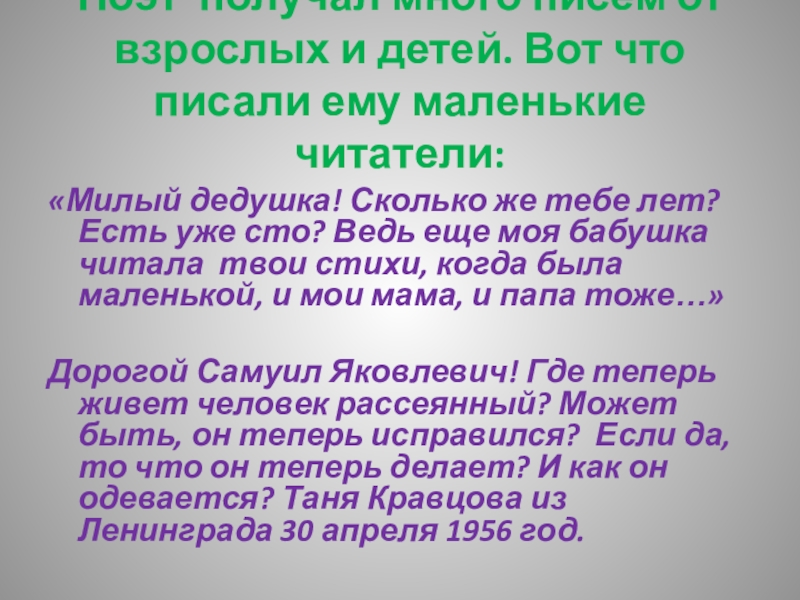 Слайд 23Поэт получал много писем от взрослых и детей. Вот что писали