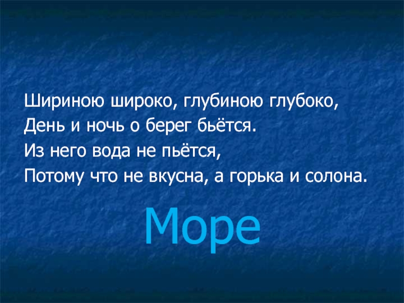 Шириною широко, глубиною глубоко,День и ночь о берег бьётся.Из него вода не пьётся,Потому что не вкусна, а