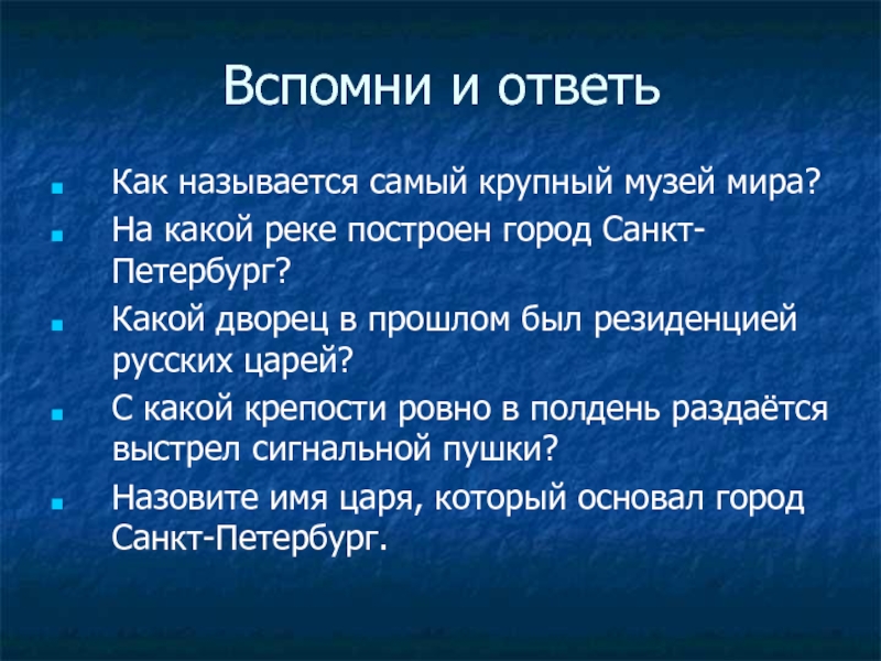 Вспомни и ответьКак называется самый крупный музей мира?На какой реке построен город Санкт-Петербург?Какой дворец в прошлом был