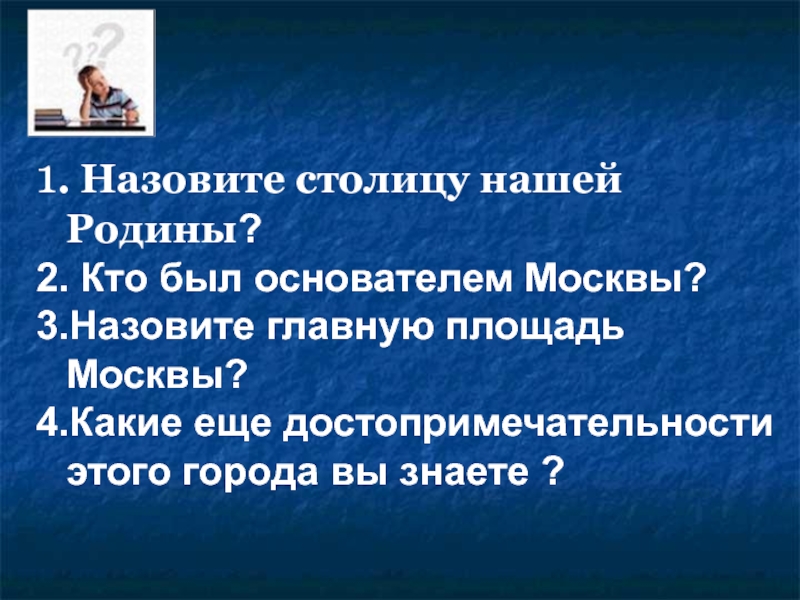1. Назовите столицу нашей Родины?2. Кто был основателем Москвы?3.Назовите главную площадь Москвы?4.Какие еще достопримечательности этого города вы