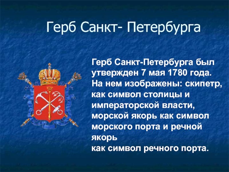 Герб Санкт- ПетербургаГерб Санкт-Петербурга был утвержден 7 мая 1780 года. На нем изображены: скипетр, как символ столицы