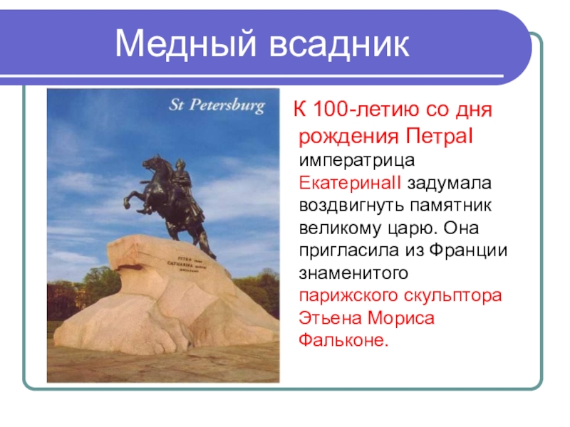Медный всадник  К 100-летию со дня рождения ПетраI императрица ЕкатеринаII задумала воздвигнуть памятник великому царю. Она