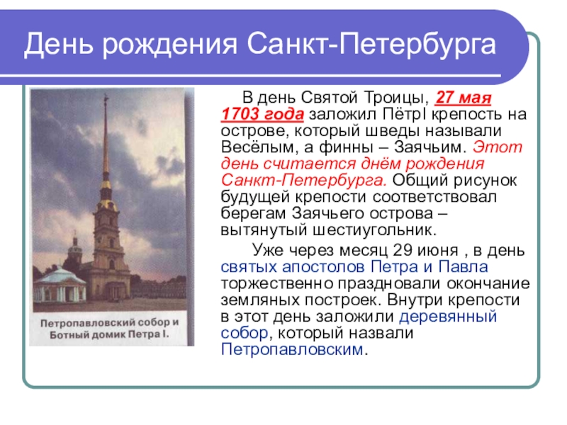 Троицы, 27 мая 1703 года заложил ПётрI крепость на острове, который шведы называли Весёлым, а финны – Заячьим. Этот день считается днём рождения Санкт-Петербурга. Общий рисунок будущей крепости соответствовал берегам Заячьего острова – вытянутый шестиугольник.