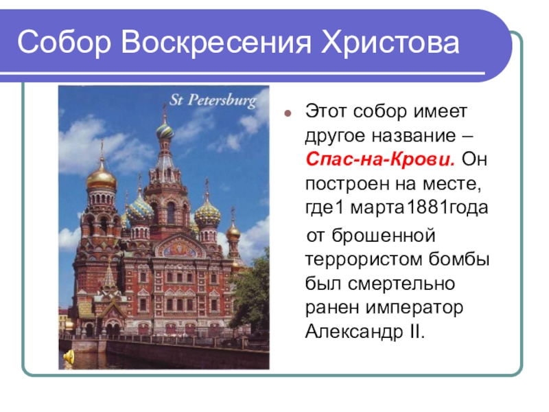 Собор Воскресения ХристоваЭтот собор имеет другое название – Спас-на-Крови. Он построен на месте, где1 марта1881года