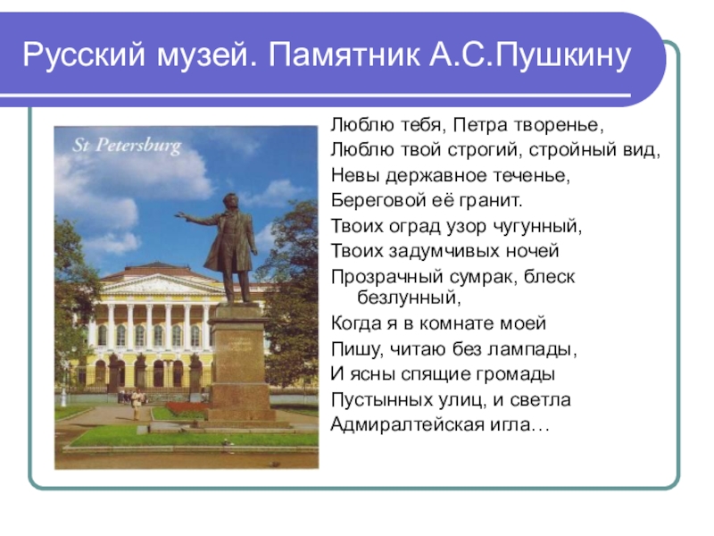 Русский музей. Памятник А.С.ПушкинуЛюблю тебя, Петра творенье,Люблю твой строгий, стройный вид,Невы державное теченье,Береговой её гранит.Твоих оград узор