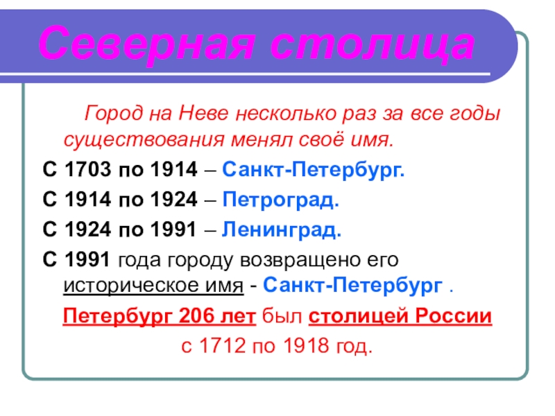 Северная столица    Город на Неве несколько раз за все годы существования менял своё имя.С