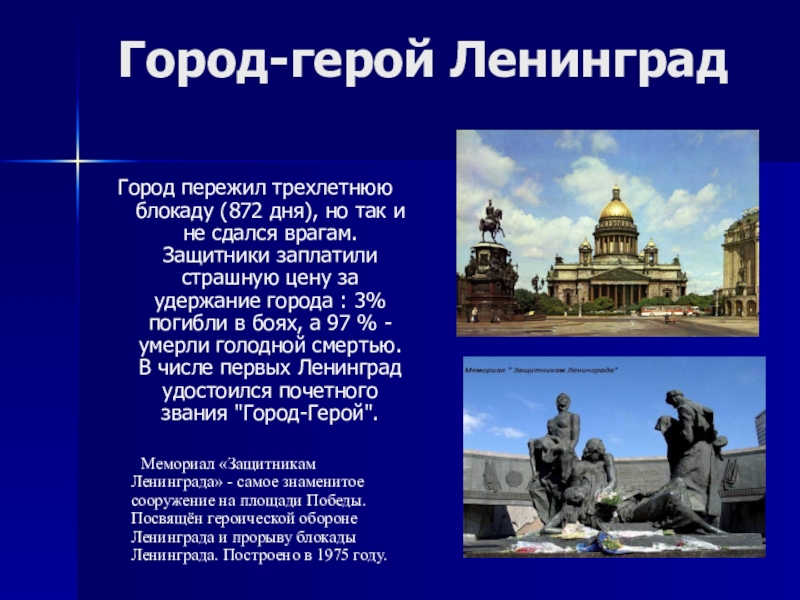сдался врагам. Защитники заплатили страшную цену за удержание города : 3% погибли в боях, а 97 % - умерли голодной смертью. В числе первых Ленинград удостоился почетного звания "Город-Герой".