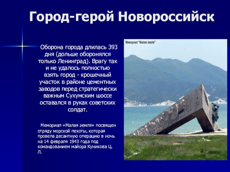 Мемориал «Малая земля» посвящен отряду морской пехоты, которая провела десантную операцию в ночь на 14 февраля 1943 года под командованием майора Куникова Ц.Л.